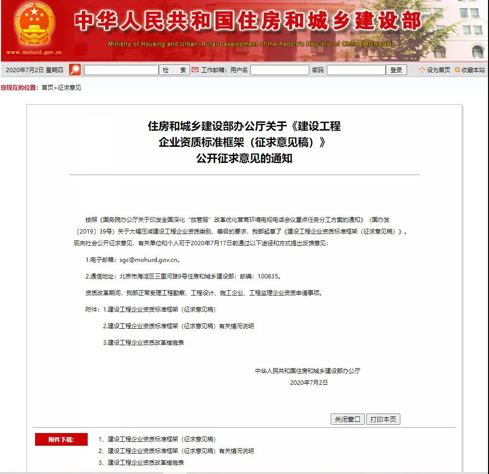 按照《國務院辦公廳關于印發(fā)全國深化“放管服”改革優(yōu)化營商環(huán)境電視電話會議重點任務分工方案的通知》(國辦發(fā)〔2019〕39號)關于大幅壓減建設工程企業(yè)資質類別、等級的要求,我部起草了《建設工程企業(yè)資質標準框架(征求意見稿)》?,F(xiàn)向社會公開征求意見,有關單位和個人可于2020年7月17日前通過以下途徑和方式提出反饋意見: